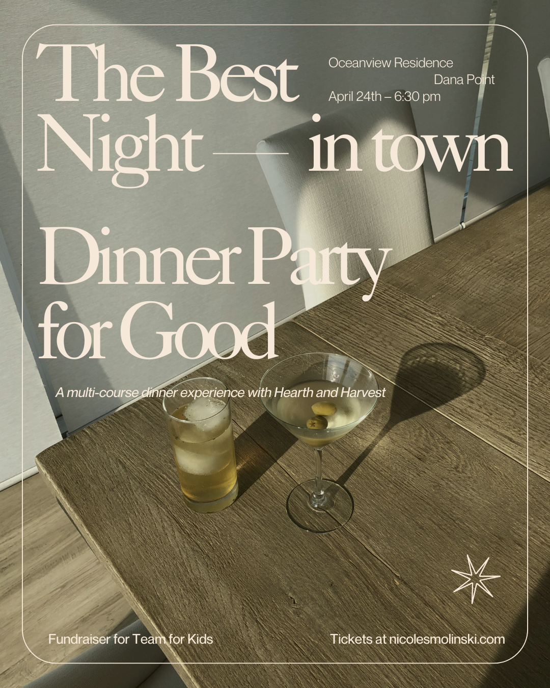 A multi-course dinner experience with private chefs, Hearth and Harvest. Hosted on Friday, April 24th at a private ocean-view residence in Dana Point.